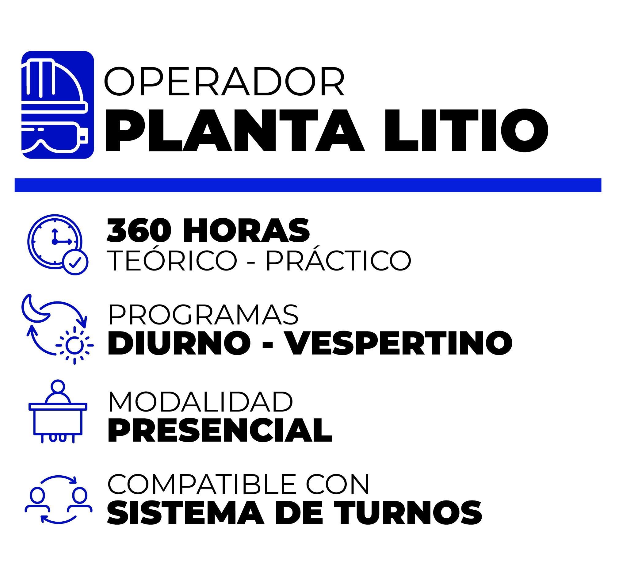 En CEFOMIN nos ocupamos de entregar formación de capital humano de excelencia; por ello, cada día es un nuevo desafío. Nuestra Escuela de Oficios 2026 tiene para ti todo lo que necesitas y ansías, para dar ese gran salto en tu carrera laboral; los programas de Operador Base Planta de Litio, Mantenedor Mecánico Base Equipos Móviles y Mantenedor Mecánico Base Equipos Fijos son tres alternativas a tu alcance, que optimizan tu tiempo y dinero.