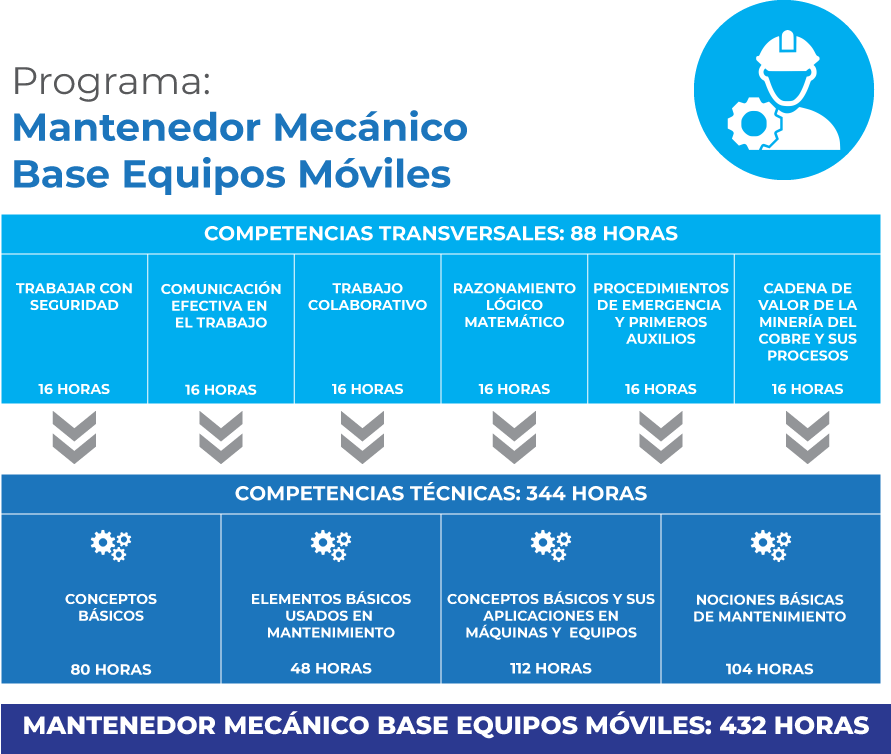 El alumno egresado del programa de entrenamiento Mantenimiento Mecánico base equipos móviles, tendrá sólidos conocimientos, habilidades y actitudes relevantes asociadas a esta actividad laboral, lo que implica revisar, apoyar y limpiar equipos y componentes en las tareas de mantenimiento de equipos móviles, pudiendo desempeñarse en empresas productivas mineras, industriales y prestadoras de servicios del rubro.
